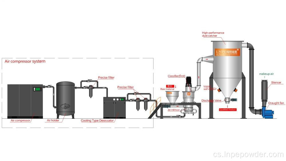 LNJ Fluidizovaný tryskový mlýn je zařízení, které používá více trysek k vytvoření zvukového rychlostního toku vzduchu k provádění superjemné rozmělnění. Pozemní materiály budou přeneseny do vysoce efektivního klasifikátoru turbíny, hrubší částice budou vířeny zpět do broušení Cham Ber pro další mletí.